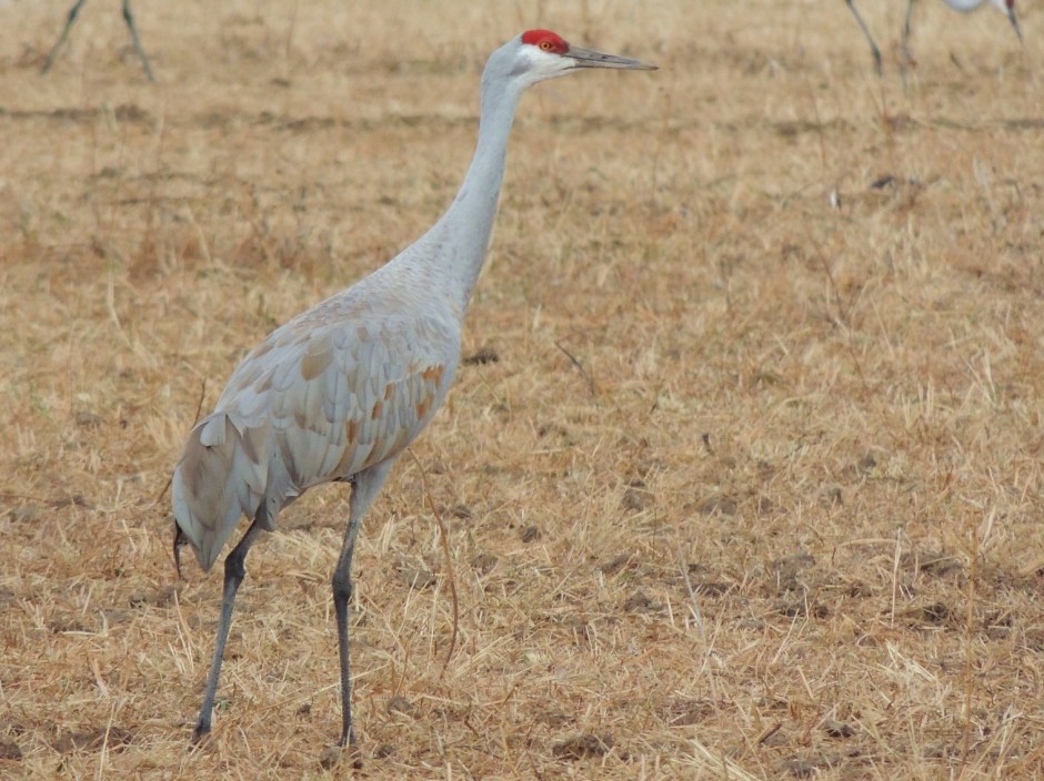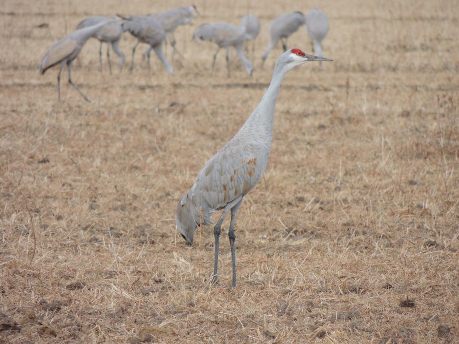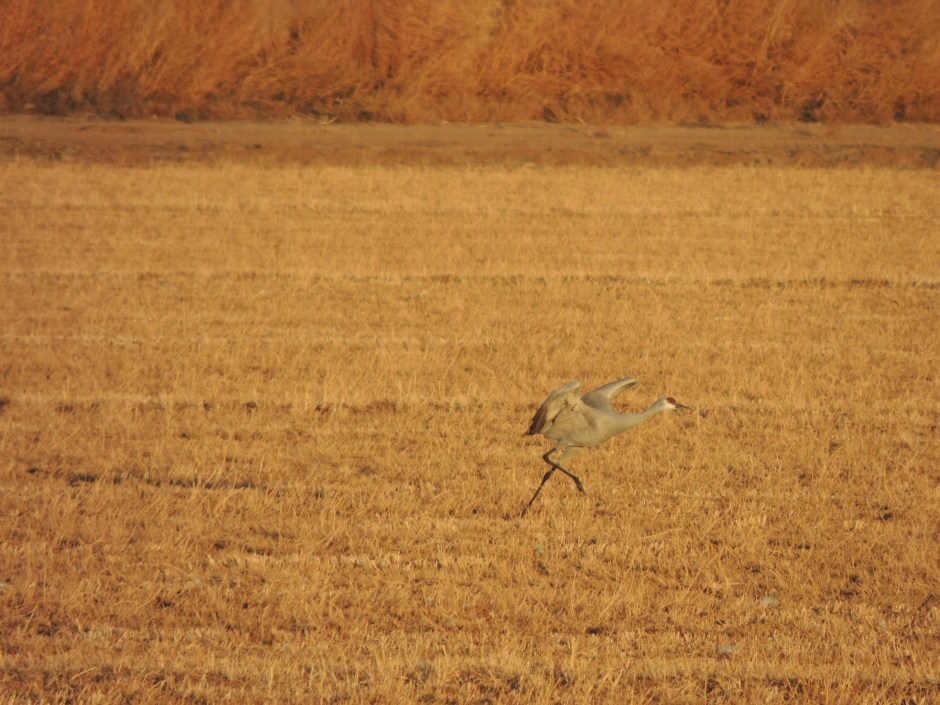 Aside from the fact that many cultures honor cranes as a special mythological symbols, I want to talk about their biological beauty. Looking at a Sandhill Crane, you immediately notice a bright crimson red cap and forehead, white cheeks, a long dark pointed bill, long legs and a slender neck. The large bodied gray bird’s plumage is dappled with rusty colored feathers which varies from bird to bird. These are large birds, weighing up to 10 – 14 pounds (4.5 to 6 kilos). They stand at around 3 – 4 feet and have a wingspan of up to 6 feet. They are fascinating to watch. During my most recent visit to the Bosque del Apache Wetlands in New Mexico, I was able to watch these wonderful cranes in the midst of the migration season. One of my favorite parts of this visit was listening to their continuous chatter. They trumpet a somewhat brash, long and loud rolling “krrr-o-o-o-o” sound which can be heard over great distances and which I felt sounded very “dinosaur-like”.