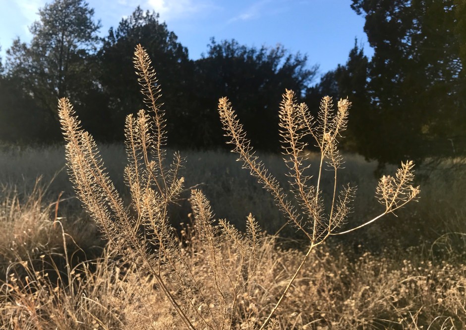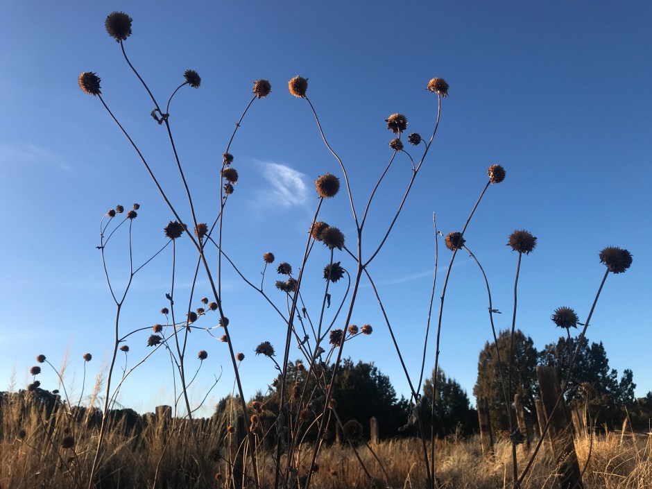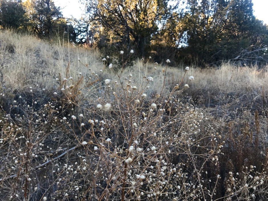 As I walk along my favorite part of the Dragonfly trails, my heart dances to see the various shapes of dormant flower heads, forbes and sedges. Most of them golden in color, some sienna-orange and brown. Their whimsy speaks to me of the true aliveness of the landscape. Wandering through a sandy arroyo I come across Raccoon tracks and smile. All the while, Juncos fly into view and just as quickly they skip away, out of view and into the junipers. As I walk, I skip too, at least in my heart as I take in the season’s sleeping beauty.