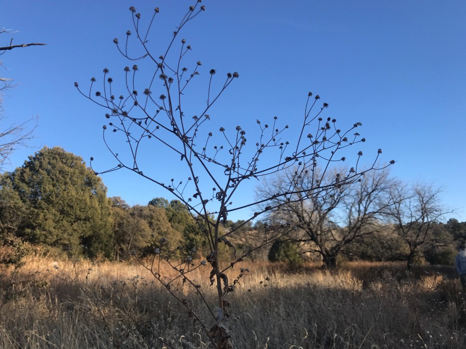 Fall and winter produce some of my absolute favorite color pallets in nature. Walking among the deep evergreened Alligator and One-seeded junipers, the dried soft blueish and deep purple berries catch my eye as natural gems. And along the watershed, the pattern-ful Cottonwood trees still impress upon me their magnificence even without green leaf-filled branches as I have seen repeatedly, on my hikes, sightings of a Red-tailed Hawk perched up on the highest branches. He peers down at me as I peer up to him. The bareness of the Willow also catch my eye as their stalks add salmon and reddish hues to the nature-painted landscape. I am not sure what kind of willows these are… perhaps Bebb’s or Strapleaf. Willows are notorious for hybridizing with one another making identification difficult for the untrained eye.